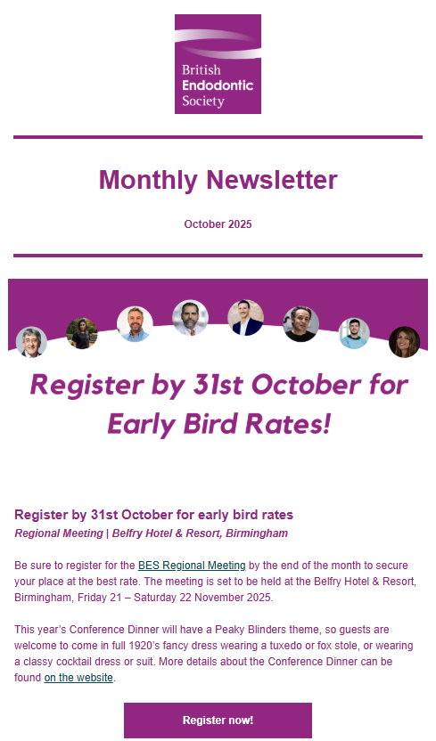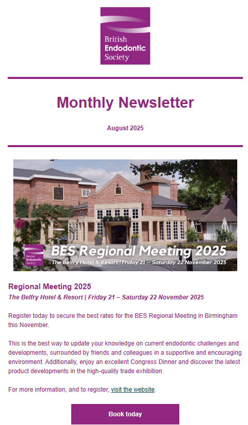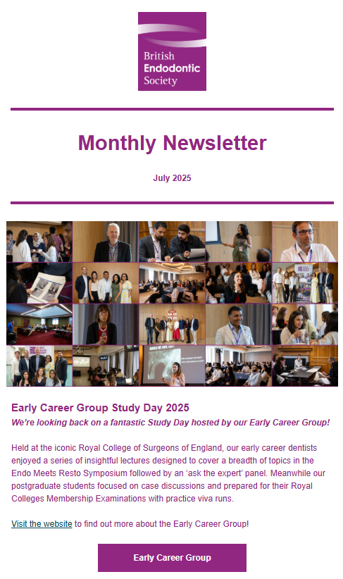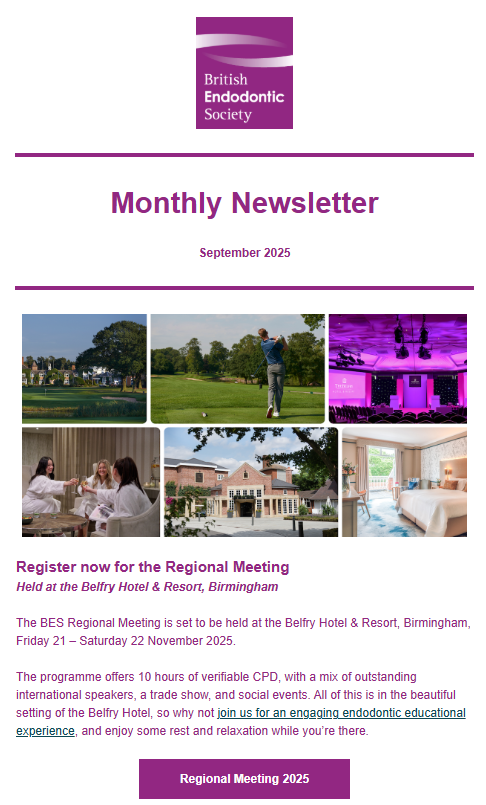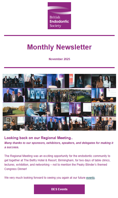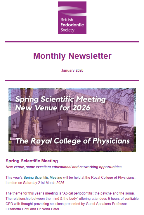 The BES produces a monthly newsletter and circulates to members towards the end of each month with updates on recent news and features in the world of Endodontics. Below are the archived copies of recent circulated newsletters.